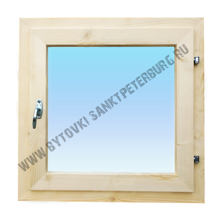 Окно изготовлено из сухого пиломатериала хвойных пород (ель, сосна). Окна ни чем не обработаны, не крашеные, остекление двойное, 2 стекла по 3 мм через деревянный штапик. Фурнитура обычная оцинкованная, петли М-8. Толщина рамы 45 мм.