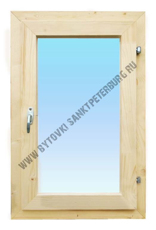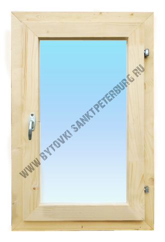 Окно изготовлено из сухого пиломатериала хвойных пород (ель, сосна). Окна ни чем не обработаны, не крашеные, остекление двойное, 2 стекла по 3 мм через деревянный штапик. Фурнитура обычная оцинкованная, петли М-8. Толщина рамы 45 мм.